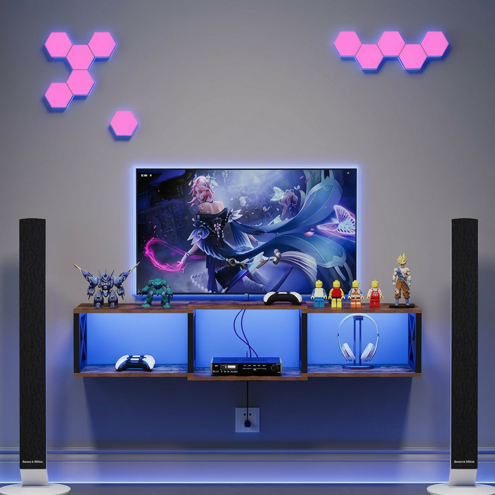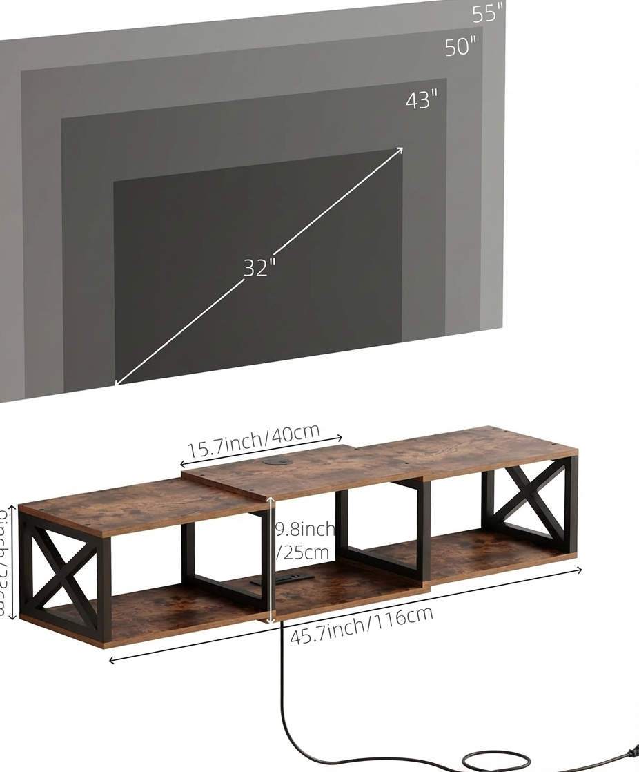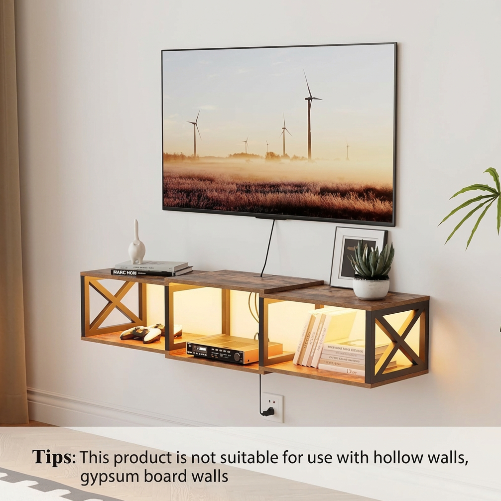 Designed with a clean open shelf layout, this wall-mounted TV console provides practical storage space for media players, cable boxes, gaming consoles, routers, remotes, books, and decorative items. The shelf can also be used as a stylish display area, combining modern aesthetics with everyday functionality for a clean and organized entertainment setup.