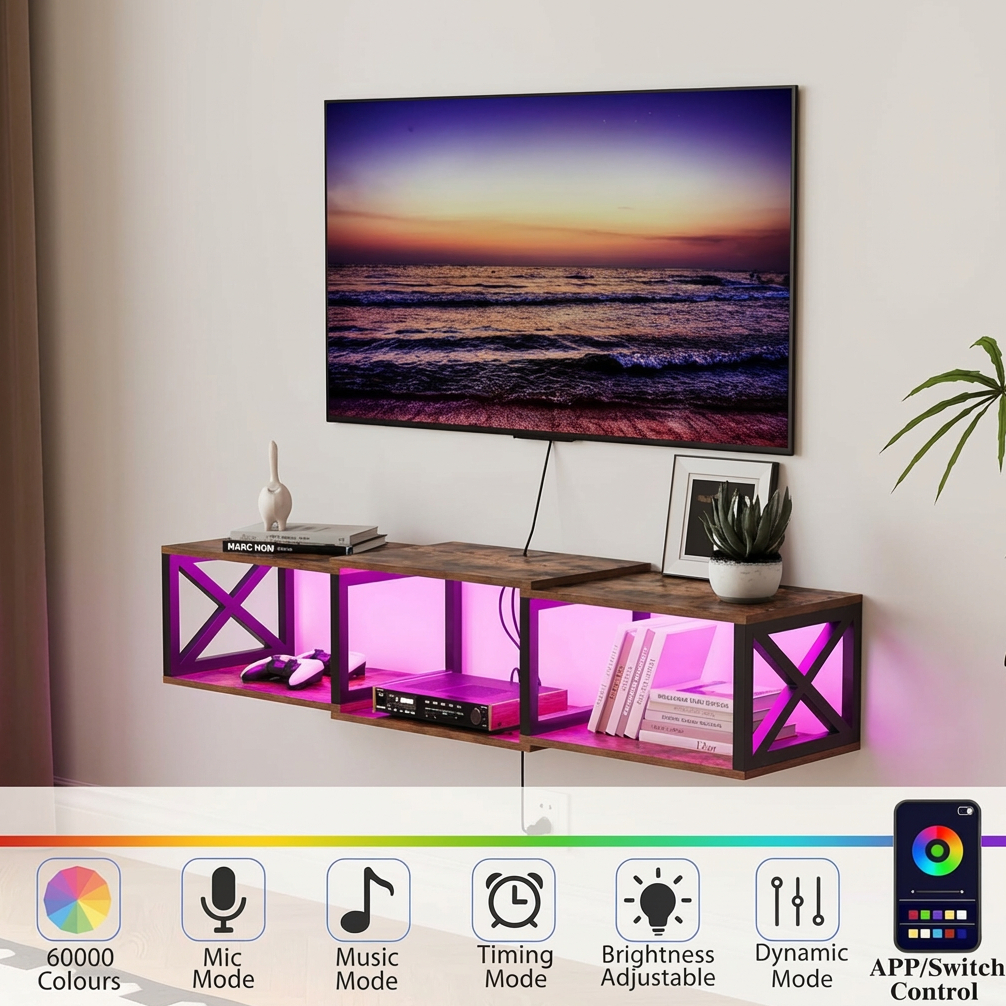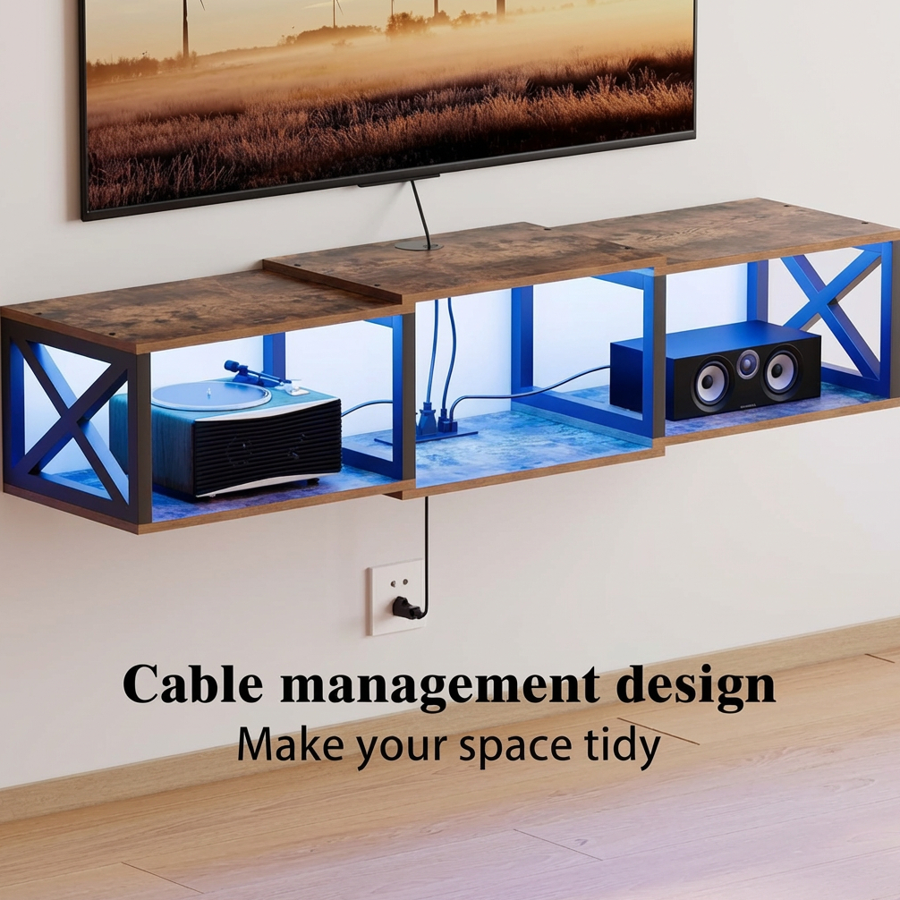 Crafted from durable engineered wood and supported by a reinforced metal frame, this floating entertainment shelf is built for long-lasting strength, stability, and safety. It comes with assembly required and includes a detailed instruction manual for straightforward setup. Whether you are organizing electronics or upgrading your home style, this 46-inch floating TV stand with LED lights and power outlets is a smart and attractive addition to any modern interior.