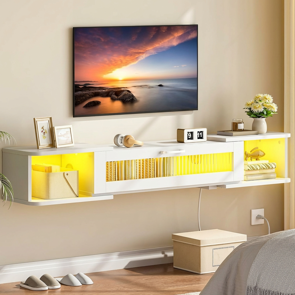 Thoughtfully designed with rounded edges, this wall-mounted TV shelf offers added safety while maintaining a sleek, contemporary appearance. The elegant reeded glass center door adds privacy while allowing light to pass through, creating a refined decorative touch that elevates the overall aesthetic of your room.