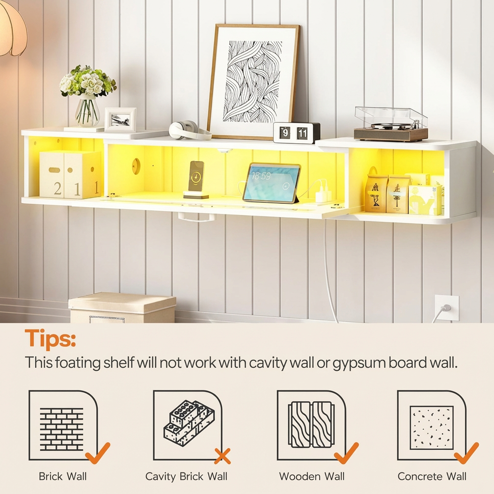 For a cleaner entertainment setup, this wall-mounted floating shelf includes built-in cable management holes to help keep wires hidden and organized. This reduces clutter and instantly improves the appearance of your space. Designed for installation on concrete, wood, and brick walls, the stand comes with the necessary hardware and clear instructions for straightforward assembly. Please note that it is not suitable for hollow walls or drywall.
