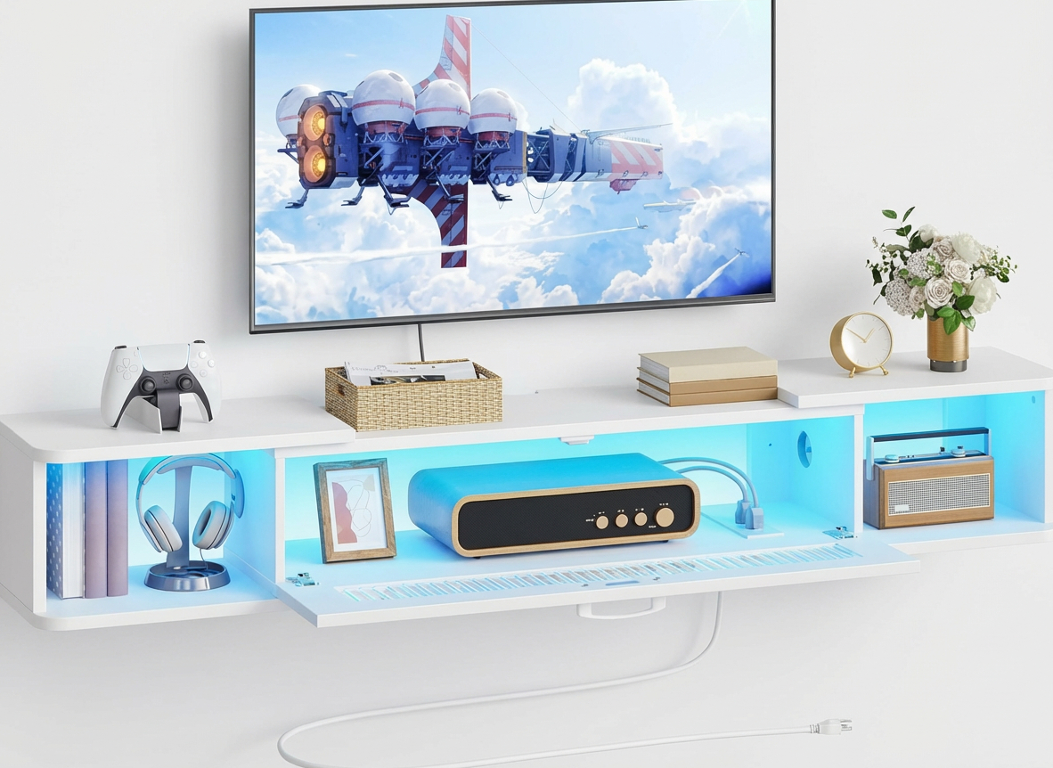 Combining modern style, hidden storage, LED lighting, charging ports, and cable management, the HOOBRO Floating TV Stand is an ideal storage and display solution for today’s organized and stylish homes.